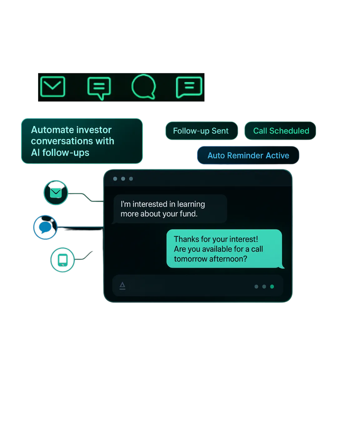 Build automated multi-channel sequences that help you educate, engage, and convert potential investors without the manual chase. Every message feels personal while running 24/7 in the background.